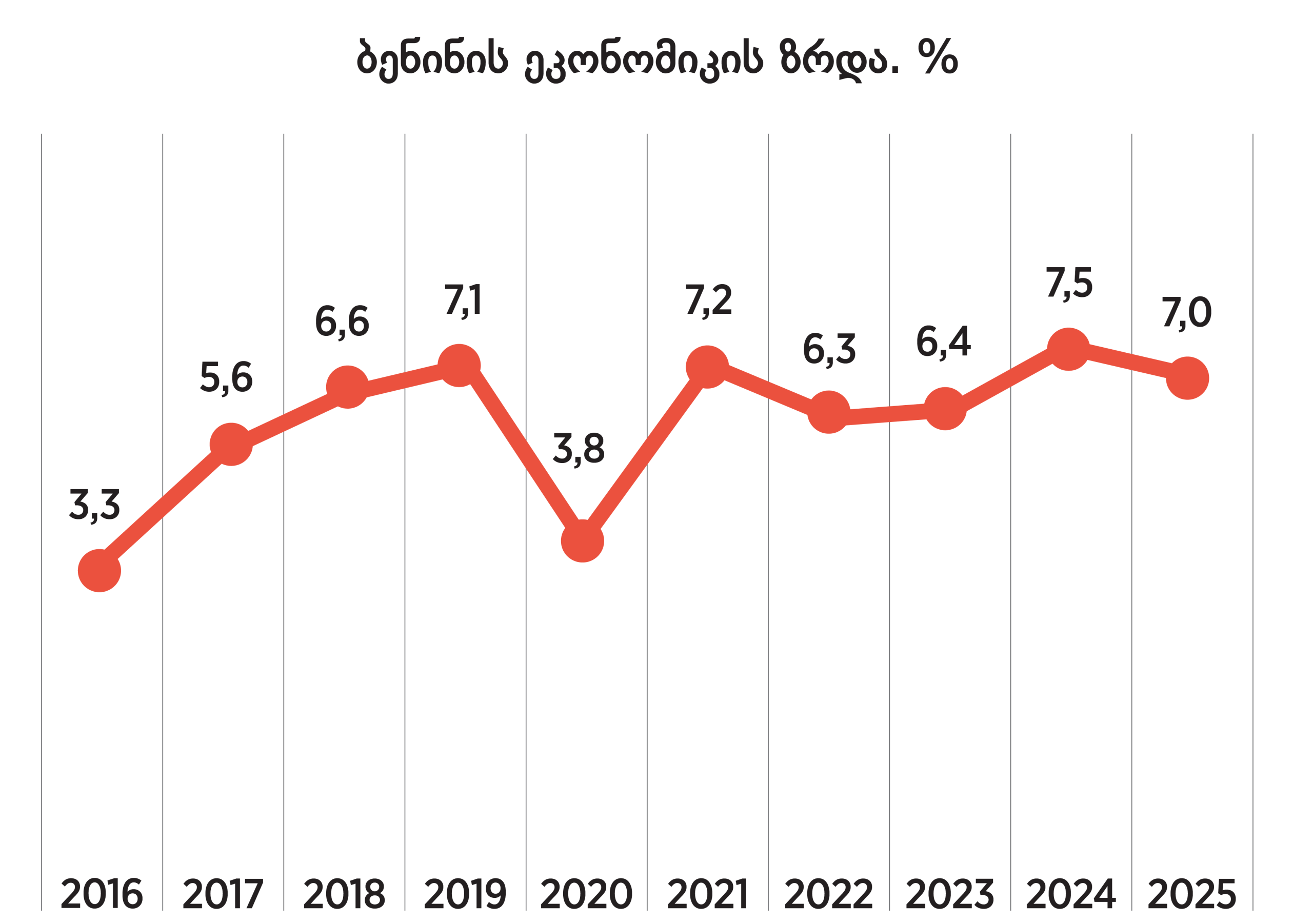 2024 წელს ბენინის ეკონომიკა 7.5%-ით გაიზარდა, 2025 წელს 7%-ით გაიზრდება. 2024-2025 წლების საშუალო ზრდის ტემპი კი 7.2%-ია. ბენინი ღარიბი აფრიკული ქვეყანაა. მიუხედავად იმისა, რომ მისი ეკონომიკა ბოლო ათი წელია, ნორმალური ტემპით იზრდება, ჯერ სიღარიბეს თავი ვერ დააღწია, ერთ მოსახლეზე შემოსავლით მსოფლიოში 153-ე ადგილზეა. ეკონომიკის ზრდასთან ერთად ქვეყნის მოსახლეობის რიცხვიც სწრაფად იზრდება, რაც ერთ მოსახლეზე საშუალო შემოსავლის ზრდის ტემპს ანელებს.