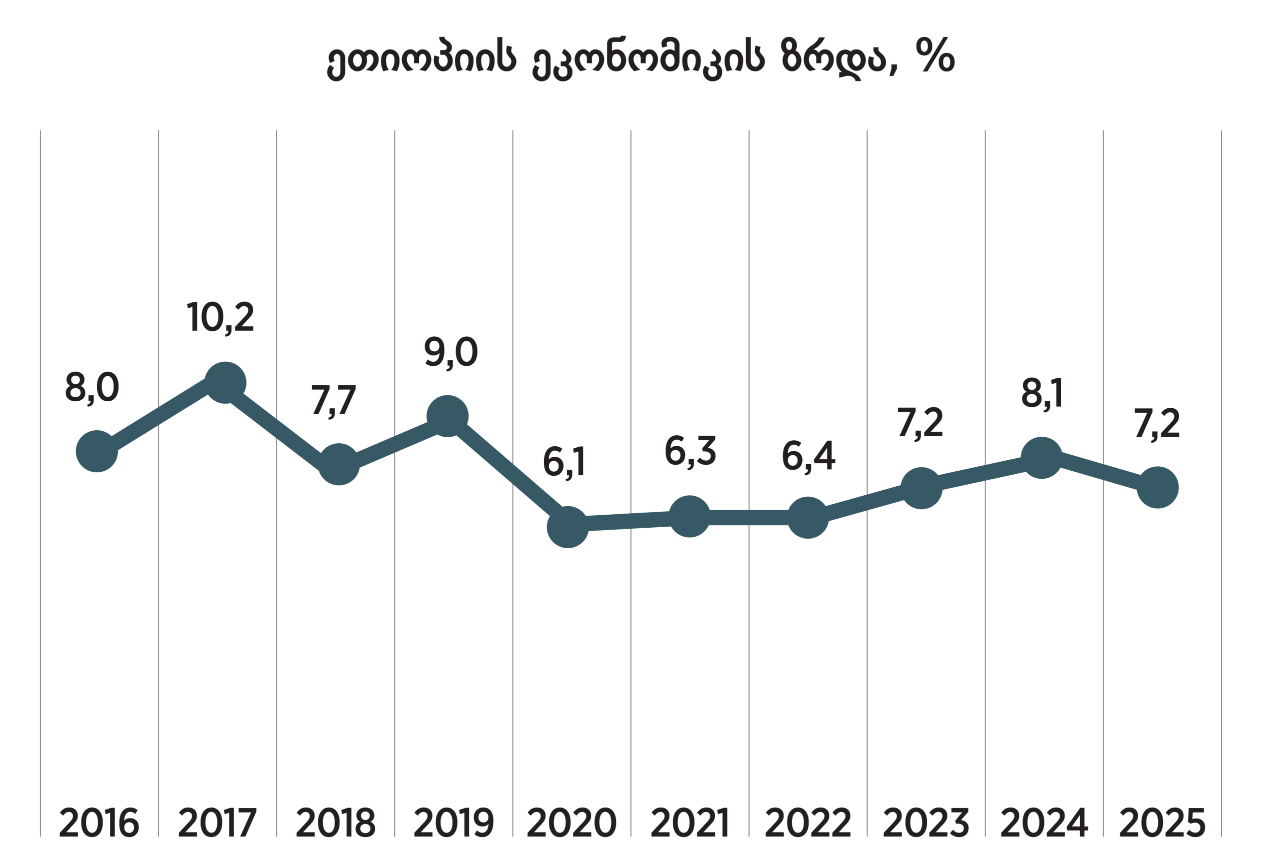 2024 წელს ეთიოპიის ეკონომიკა 8.1%-ით გაიზარდა, 2025 წელს 7.2%-ით გაიზრდება. 2024-2025 წლების საშუალო ზრდის ტემპი კი 7.6%-ია. ეთიოპიაც ღარიბი აფრიკული ქვეყანაა, სადაც დემოგრაფიული ბუმია. ბოლო ათ წელიწადში მოსახლეობა 23%-ით გაიზარდა, რაც ერთ მოსახლეზე საშუალო შემოსავლის ზრდის ტემპს ანელებს. ერთ მოსახლეზე შემოსავლით ეთიოპია მსოფლიოში 157-ე ადგილზეა.