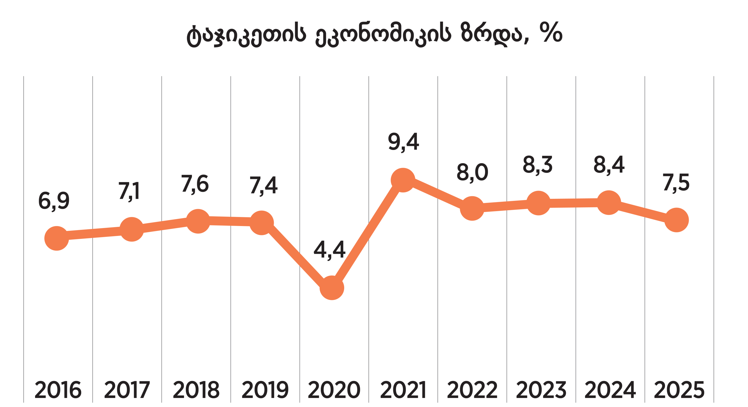 2024 წელს ტაჯიკეთის ეკონომიკა 8.4%-ით გაიზარდა, 2025 წელს 7.5%-ით გაიზრდება. 2024-2025 წლების საშუალო ზრდის ტემპი კი 7.9%-ია. ტაჯიკეთშიც დემოგრაფიული ბუმია. ბოლო ათ წელიწადში მოსახლეობა 28%-ით გაიზარდა, რაც ერთ მოსახლეზე საშუალო შემოსავლის ზრდის ტემპს ანელებს. ერთ მოსახლეზე შემოსავლით ტაჯიკეთი მსოფლიოში 145-ე ადგილზეა.