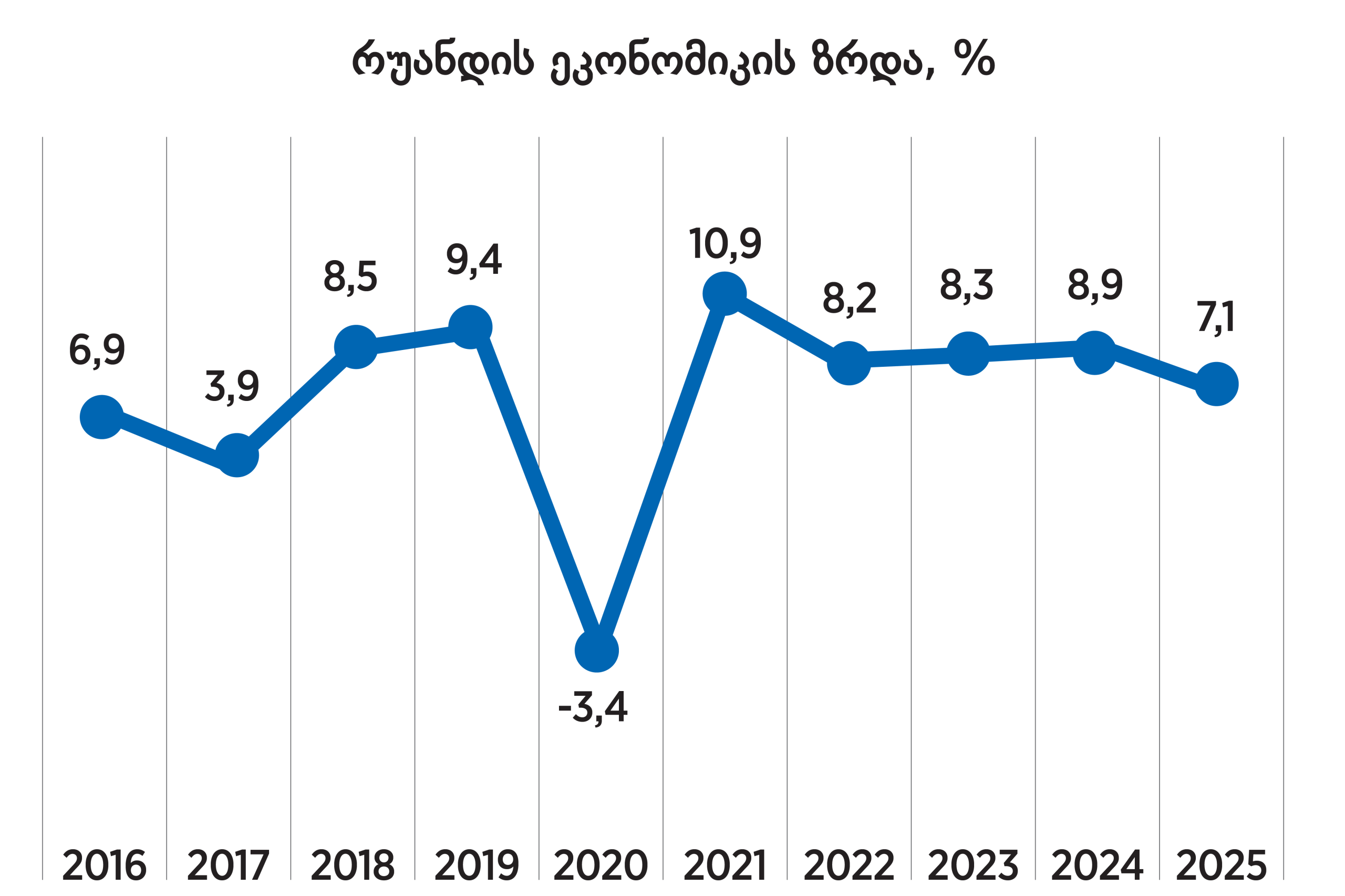 რუანდა 1990-იან წლებში გენოციდით ძალიან დაზარალებული, პატარა, რესურსებით ღარიბი ქვეყანაა, თუმცა ბოლო წლებში პოლიტიკური სტაბილურობა აქვს და ბევრი რეფორმა გაატარა. ბოტსვანასთან ერთად აფრიკის კონტინენტზე ყველაზე ნაკლებად კორუმპირებული ქვეყანაა. კორუფციის რეიტინგში 43-ე ადგილზეა (საქართველო 53-ე ადგილზეა). სწრაფად იზრდება მომსახურების სექტორი, მნიშვნელოვან ინვესტიციებს დებს ინფრასტრუქტურაში.