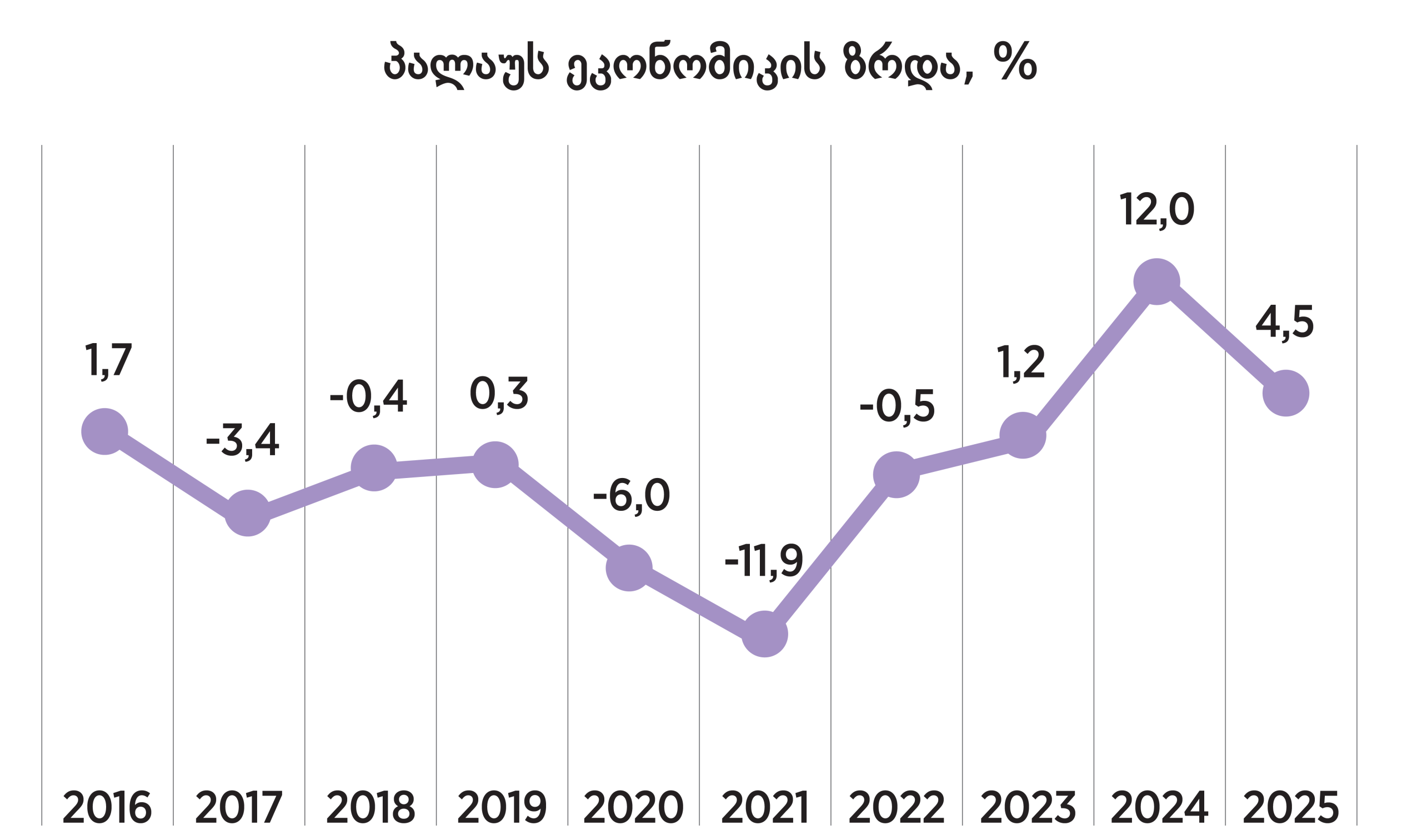 პალაუს ეკონომიკა მაღალი ზრდით არ ხასიათდება, 2024-2025 წლებში დაფიქსირებული ზრდა იმის შედეგია, რომ 2017-2022 წლებში მცირდებოდა და კრიზისიდან გამოვიდა. მისი ეკონომიკის მთავარი დარგი ტურიზმია, შემდეგ მოდის სოფლის მეურნეობა და თევზჭერა. როცა ტურიზმი იზრდება, პალაუს ეკონომიკაც იზრდება.