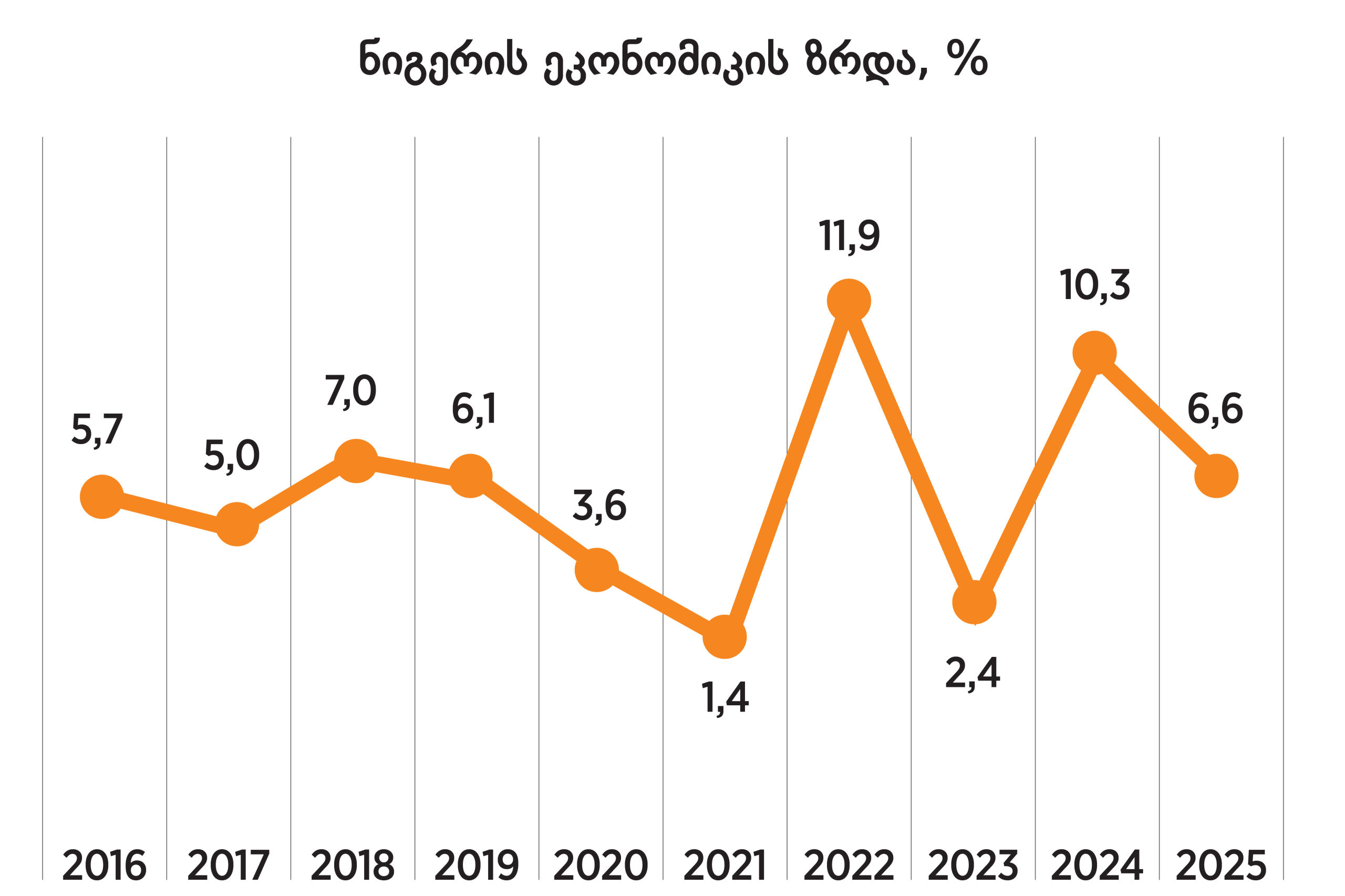 ნიგერის ეკონომიკის ზრდის მთავარი ფაქტორი ბუნებრივი რესურსებია. ნიგერმა გაზარდა ნავთობის, ოქროს და ურანის მოპოვება. ასევე მნიშვნელოვანი ინვესტიციები ჩაიდო ინფრასტრუქტურაში, ყველაზე მსხვილი დონორი ჩინეთია. ერთი მხრივ, დემოგრაფიული ბუმი აფერხებს სიღარიბის დაძლევას, მაგრამ ამავე დროს, ჭარბი იაფი სამუშაო ძალის წყაროა, რაც ეკონომიკურ ზრდას ხელს უწყობს.