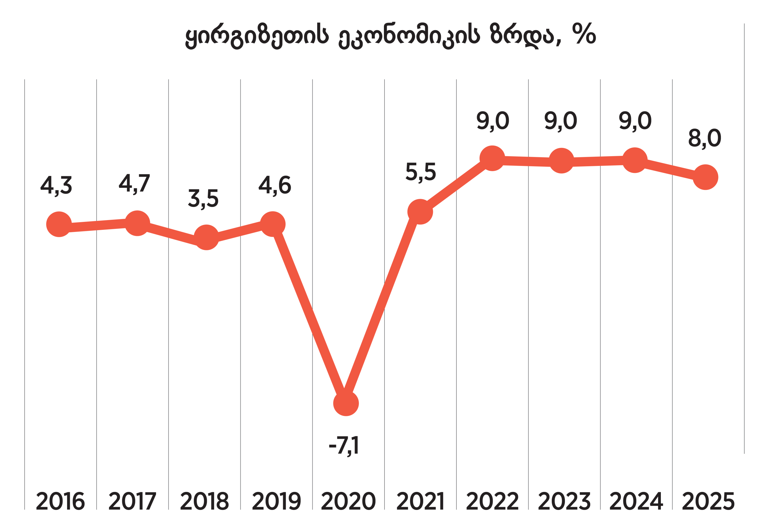 2024 წელს ყირგიზეთის ეკონომიკა 9%-ით გაიზარდა, 2025 წელს 8%-ით გაიზრდება. 2024-2025 წლების საშუალო ზრდის ტემპი კი 8.5%-ია. ბოლო ათ წელიწადში ყირგიზეთის მოსახლეობა 21%-ით გაიზარდა, რაც ერთ მოსახლეზე საშუალო შემოსავლის ზრდის ტემპს ანელებს. ერთ მოსახლეზე შემოსავლით ყირგიზეთი მსოფლიოში 130-ე ადგილზეა.