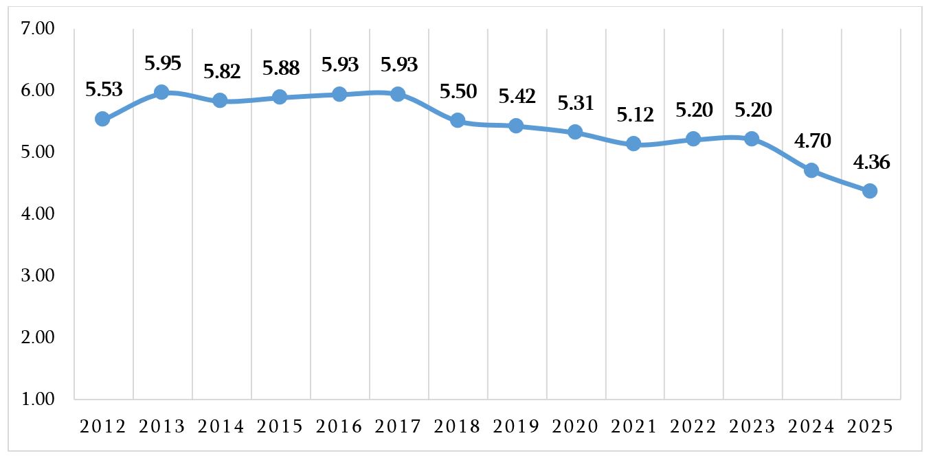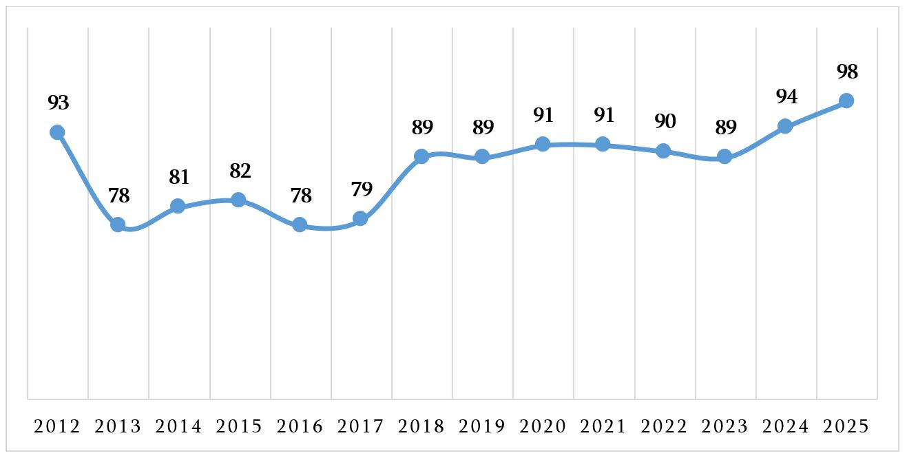 2024-2025 წლებში საქართველოს ქულა 0.85-ით შემცირდა და რეიტინგში 9 საფეხურით ჩამოქვეითდა.