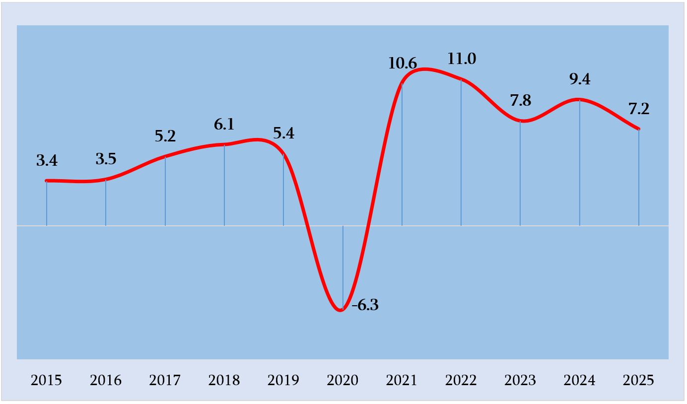 საერთაშორისო სავალუტო ფონდის მიერ 2025 წლის ოქტომბერში გამოქვეყნებული ეკონომიკის ზრდის პროგნოზების მიხედვით, საქართველოს ეკონომიკა 2025 წელს 7.2%-ით გაიზრდება. სწორედ 7.2%-იანი ზრდით იკავებს საქართველო მე-7 ადგილს მსოფლიოში. საქართველოს ეკონომიკაზე სწრაფად მხოლოდ 6 ქვეყნის ეკონომიკა გაიზრდება.