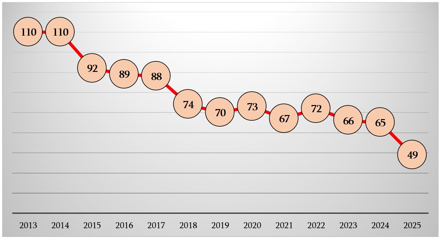 2025 წლის 14 ოქტომბერს გამოქვეყნებული ახალი რეიტინგის მიხედვით, რომელიც 2024 წლის მდგომარეობას ასახავს, საქართველო 126 ქვეყნიდან 49-ე ადგილზეა 5.367 ქულით (10 ქულიდან). 2024 წელს გამოქვეყნებულ რეიტინგში საქართველო 65-ე ადგილზე იყო 4.931 ქულით. საქართველოს ქულა 0.436-ით გაიზარდა და ქვეყანა რეიტინგში 16 ადგილით დაწინაურდა. ქულის მატება გარკვეულწილად მეთოდოლოგიის ცვლილებამ გამოიწვია.