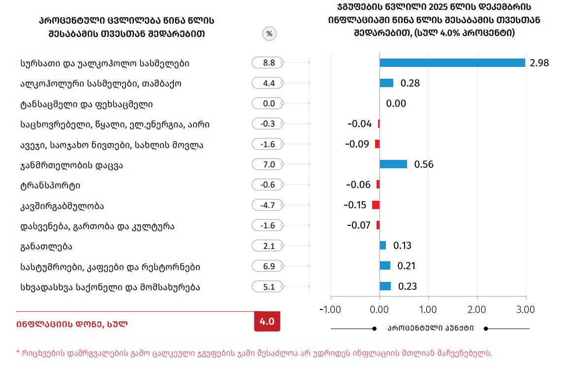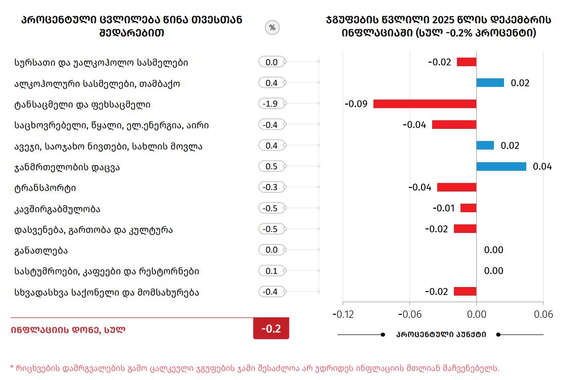 სტატისტიკის ეროვნული სამსახურის მონაცემებით, 2025 წლის დეკემბერში, წინა თვესთან შედარებით, საქართველოში ინფლაციის დონემ -0.2 პროცენტი შეადგინა, ხოლო წლიური ინფლაციის მაჩვენებელი 4 პროცენტით განისაზღვრა.