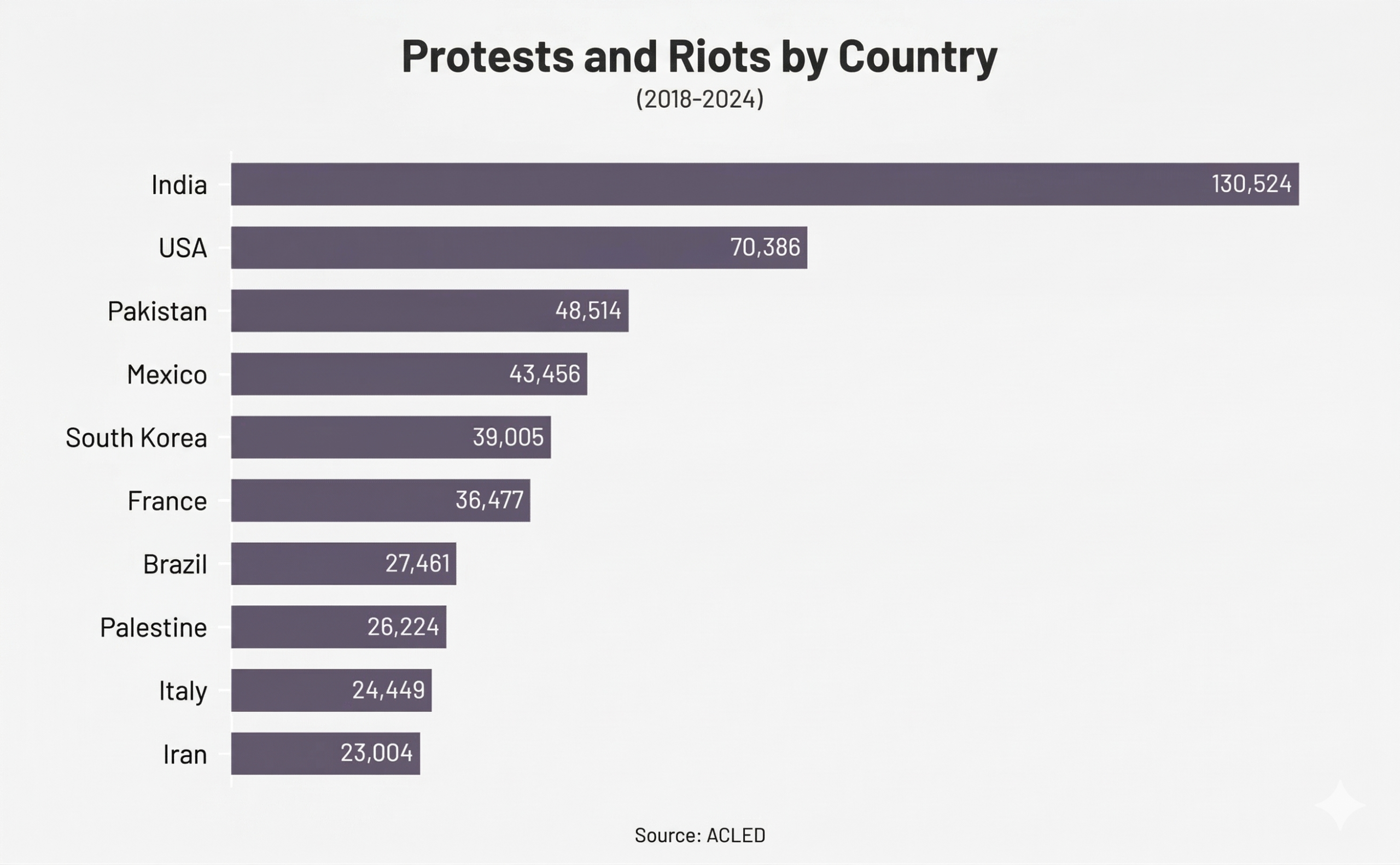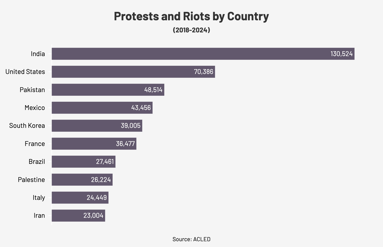 At the country level, ACLED data for 2018–2024 puts India, the United States, and Pakistan in the top three.