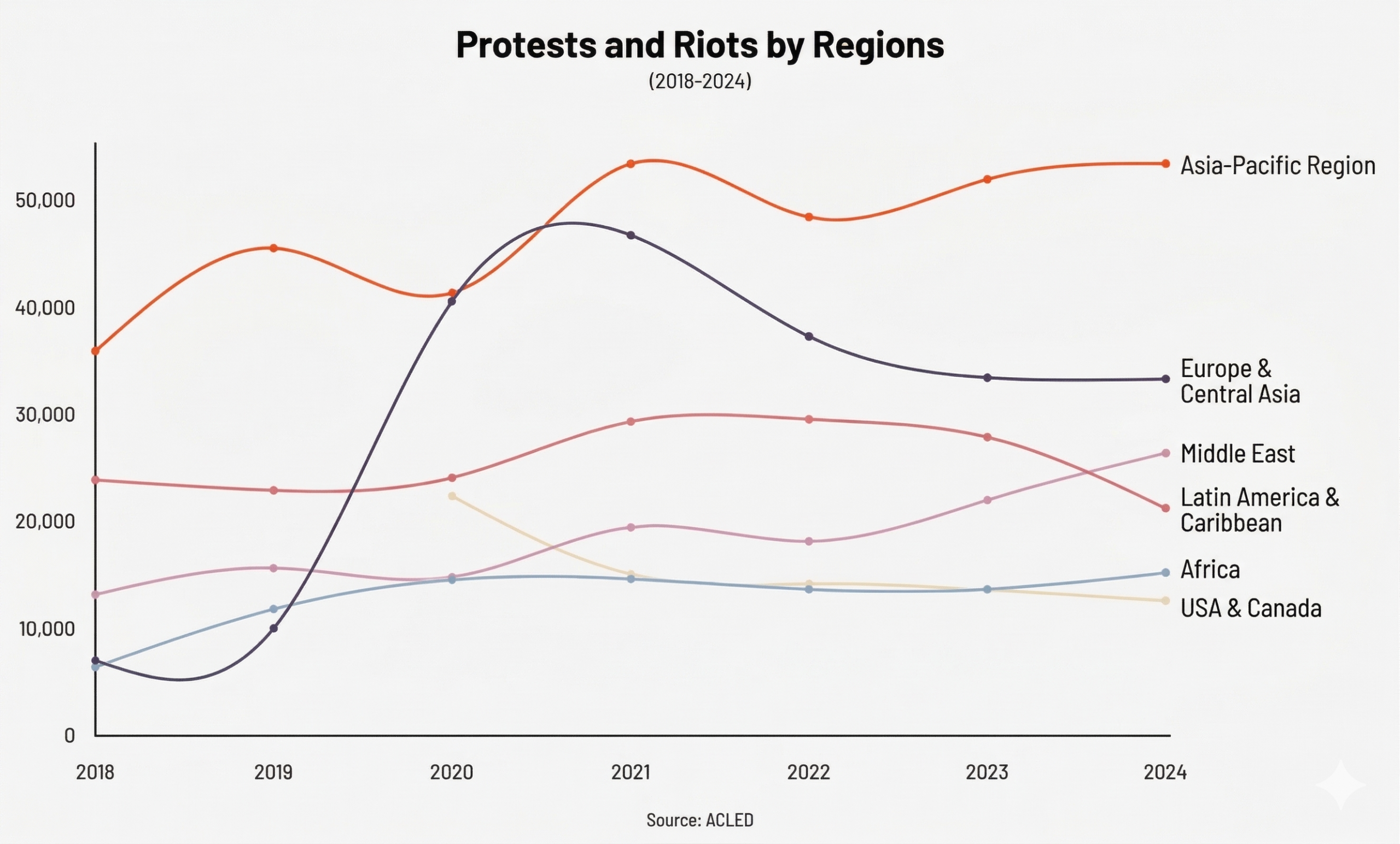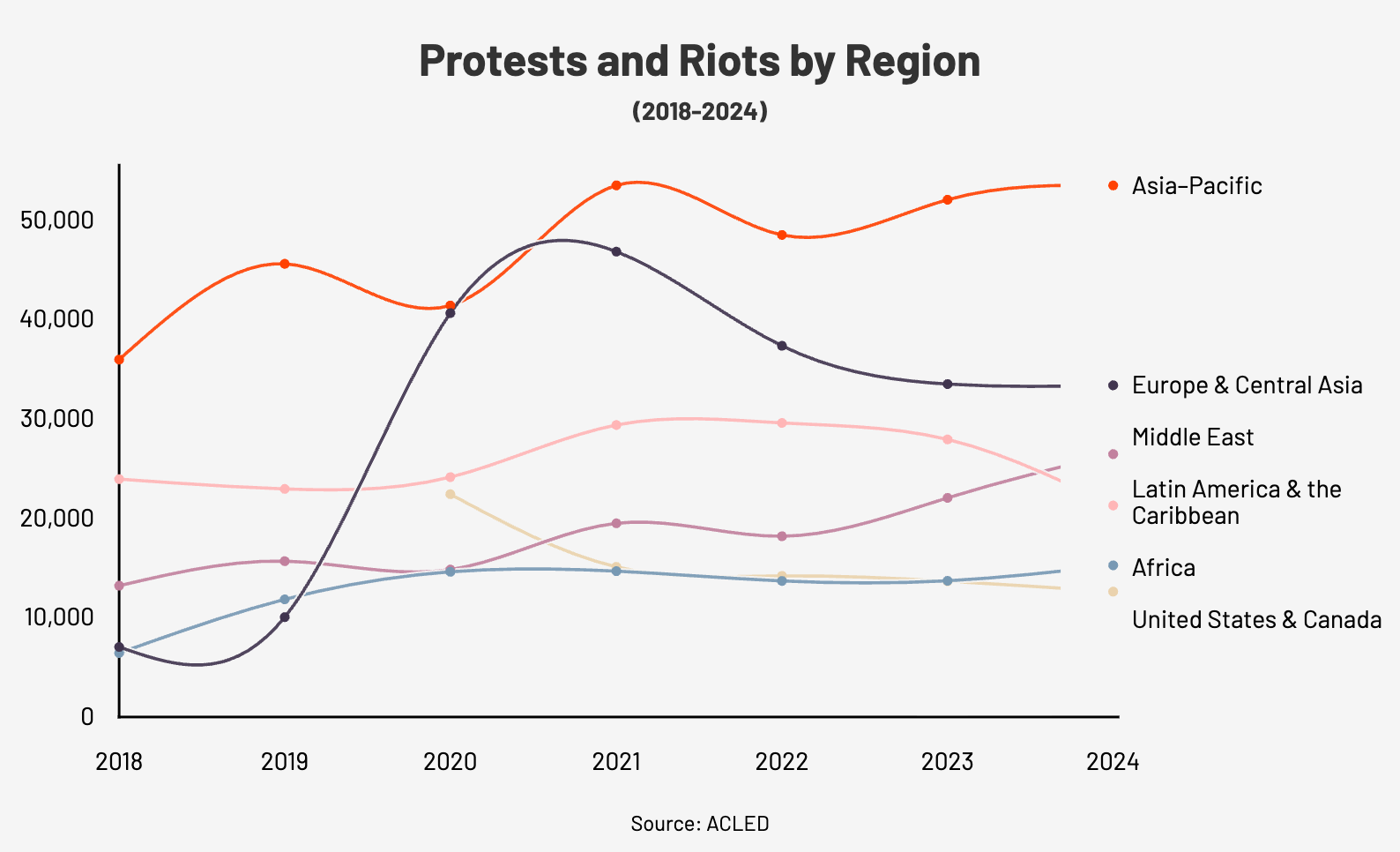 Which regions stand out for protest frequency? The data shows that the Asia-Pacific region leads by number of protests, followed by Europe and Central Asia, and then Latin America and the Caribbean.