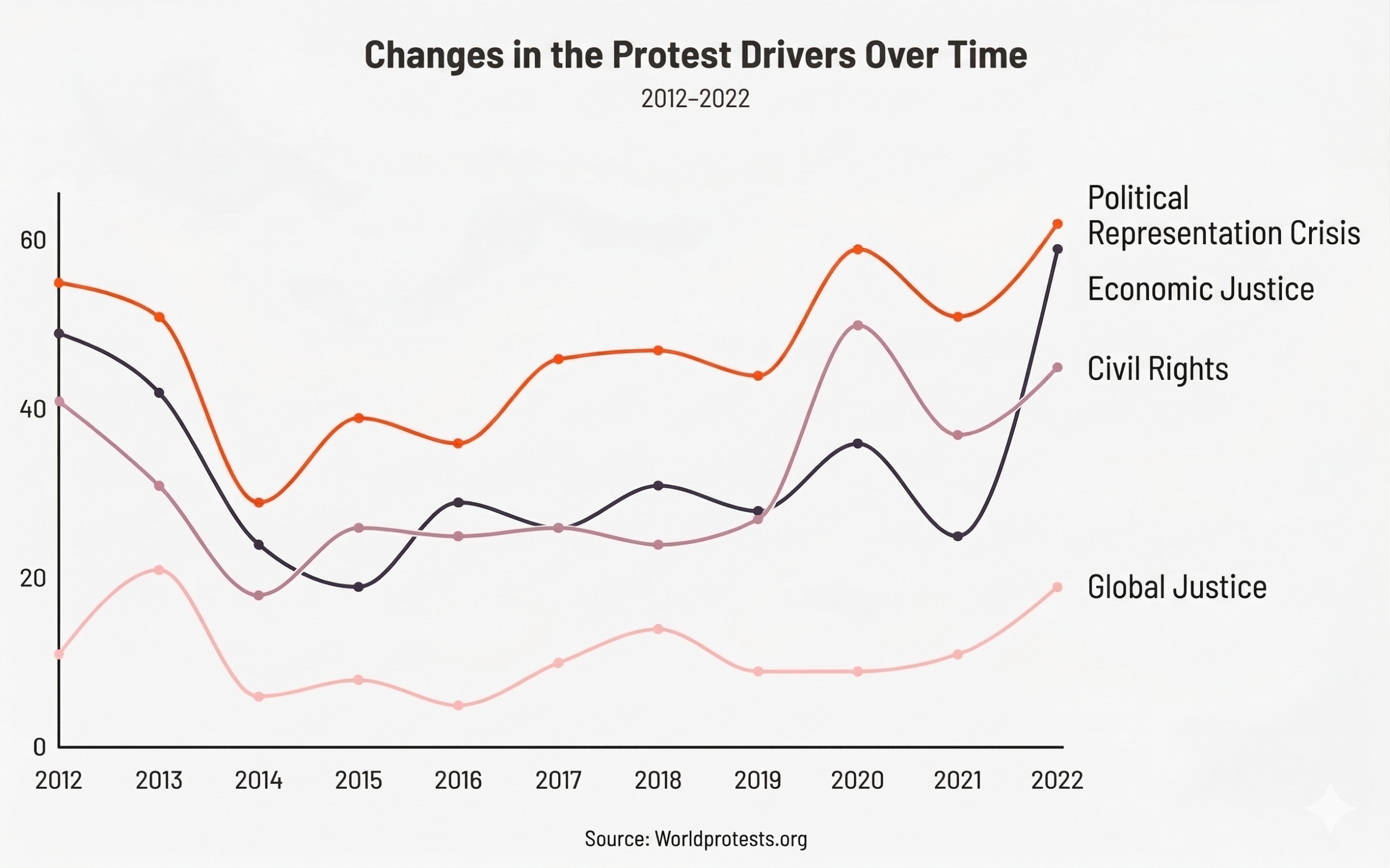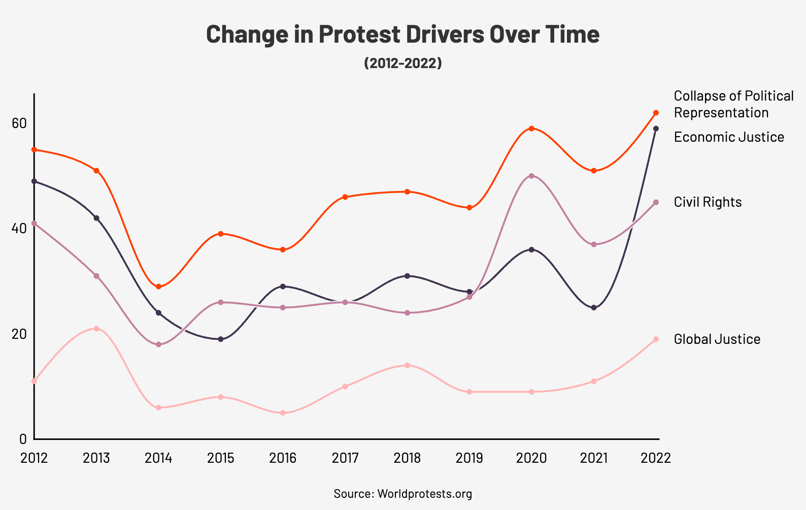 To track how protest causes have shifted over time, data from 2012 to 2022 was analyzed. Over that period, the leading driver of protest was the failure of political representation, followed by economic justice, civil rights, and global justice.