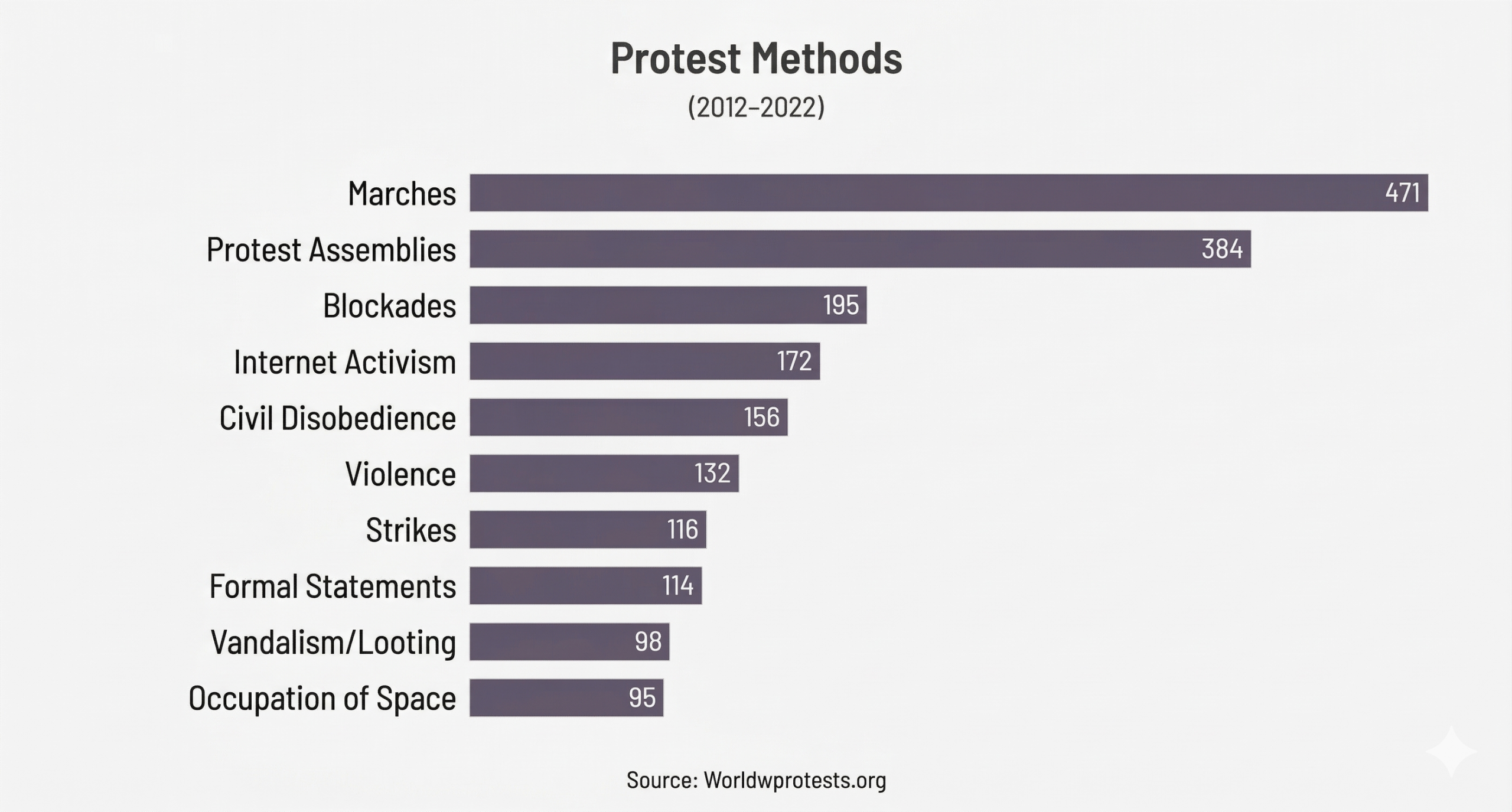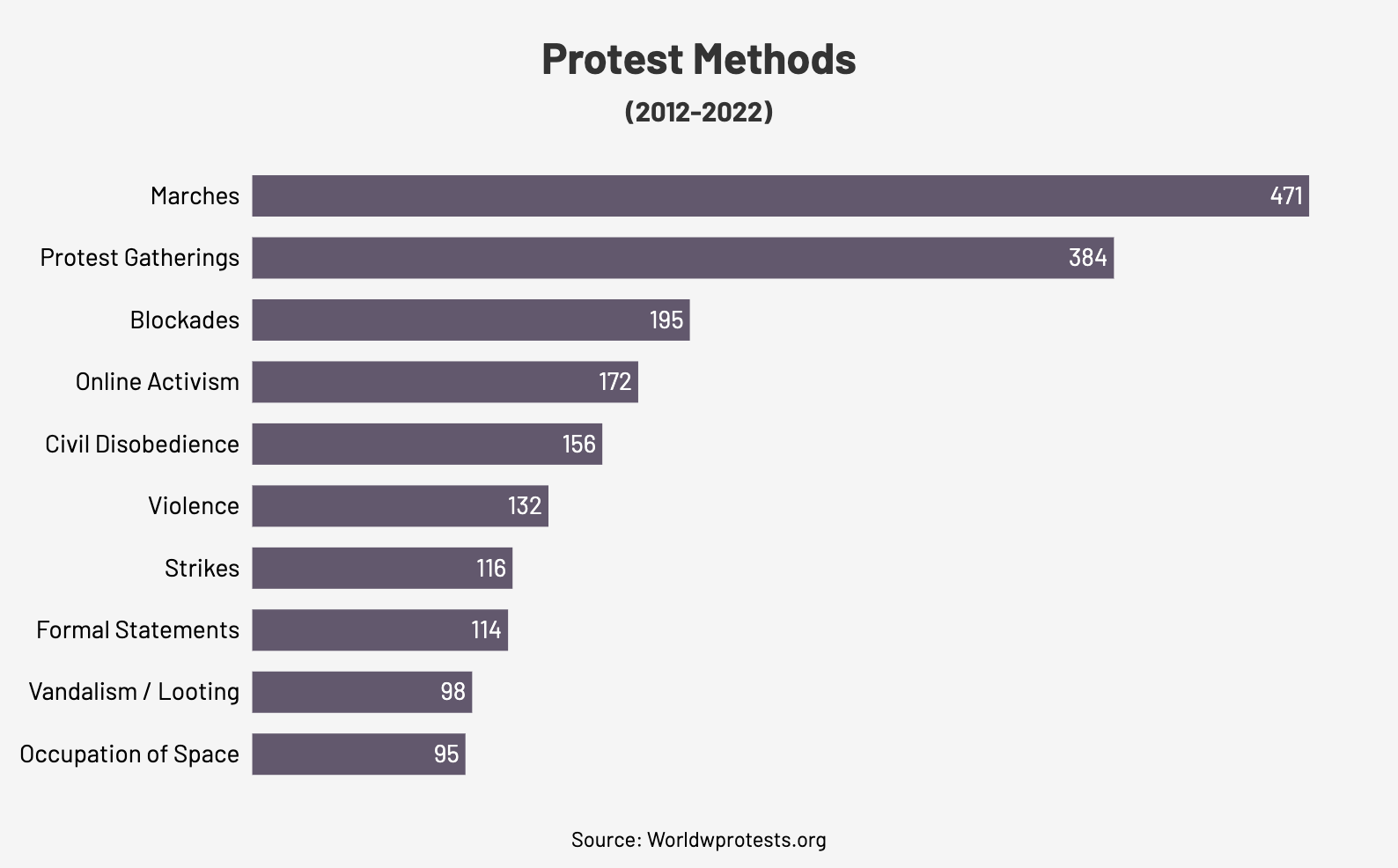 Protesters use a range of tactics, with marches, rallies, and blockades being the most common. Online activism comes next — a sign of civil disobedience entering a new, digital era. Violence and vandalism account for a comparatively small share.
