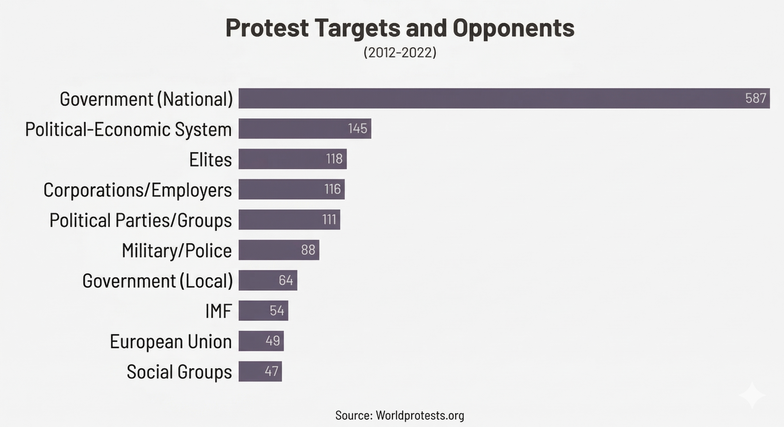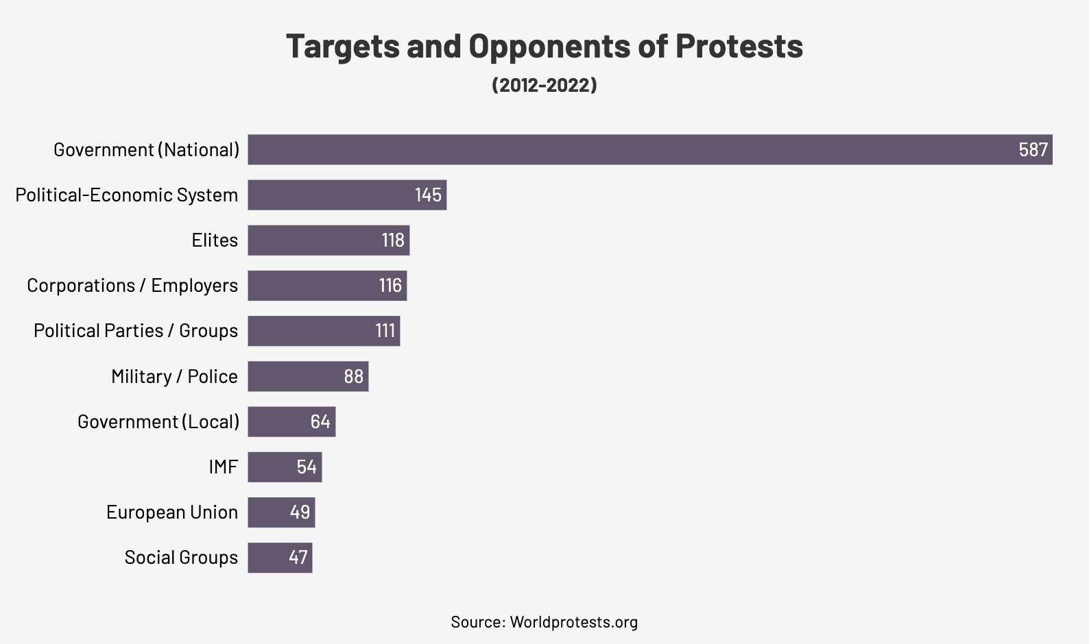 The biggest target of protest, by a wide margin, is the national government. Beyond that, demonstrators frequently push back against the broader political and economic system, elites, corporations, and employers.