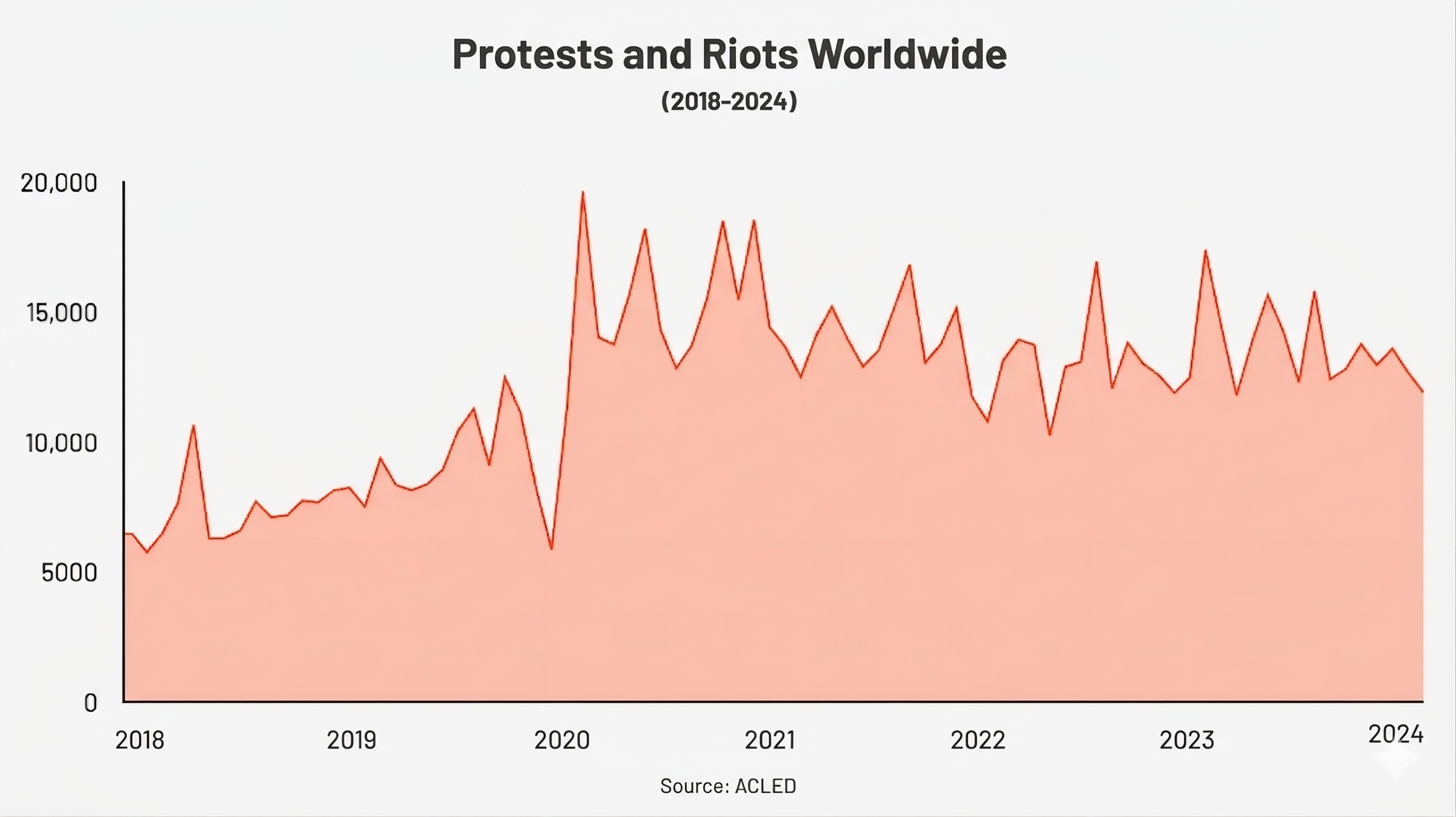 As for 2024 specifically, the same organization recorded 160 significant anti-government protests globally. One notable trend stood out: because an unusually high number of elections were held last year, dissatisfaction with results and other political factors rose considerably.