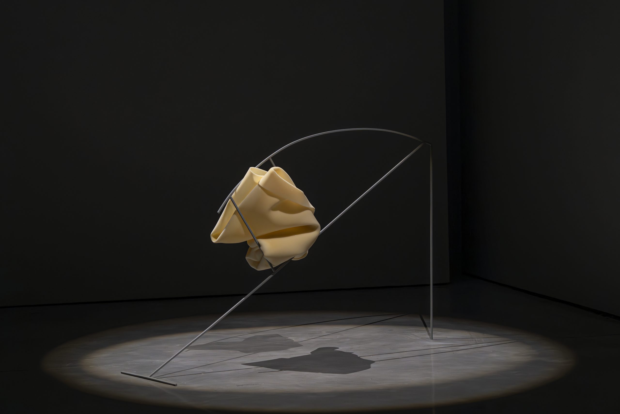 აღნიშნული ნამუშევარი შედგება მეტალის თხელი კონსტრუქციისგან, რომელიც ქმნის მსუბუქ, მინიმალისტურ ჩარჩოს. ჩარჩოში ჩასმულია რბილი, მოყვითალო-კრემისფერი მასალა (ტექსტილი), რომელიც თითქოს შემთხვევით დაკეცილ-დახვეულია. კომპოზიცია აერთიანებს მკაცრ გეომეტრიას და ორგანულ რბილ ფორმას. რბილი მასალის გამოყენება ქმნის განცდას, რომ ნამუშევარი მუდმივ ცვლილებაშია, თითქოს შეიძლება ნებისმიერ დროს ჩამოიშალოს ან შეიცვალოს. ეს დროებითობისა და დაუმთავრებლობის განცდა ხშირია ჯორჯაძის შემოქმედებაში. მეტალის სტრუქტურა ასოცირდება სიმტკიცესთან, ხოლო ქაფი – ერთგვარ დაუცველობასთან. მათი გაერთიანება გამოხატავს საპირისპირო მდგომარეობების თანაცხოვრებას. ნამუშევარს არ აქვს აშკარა ნარატივი, მაგრამ ის იწვევს ემოციურ ასოციაციებს: შეიძლება წარმოვიდგინოთ როგორც შიდა სივრცის ფრაგმენტი, სხეულის კვალი ან აბსტრაქტული ობიექტი, რომელიც აერთიანებს ყოფითსა და აბსტრაქტულს. ნამუშევარი შეიძლება აღვიქვათ, როგორც პირადი სივრცის არტეფაქტი, სადაც რბილი მასალა სხეულის ან ყოფითი ნივთის კვალს გვაგონებს, ხოლო მინიმალისტური ჩარჩო – სივრცის არქიტექტურულ ჩარჩოს. თეა ჯორჯაძის აღნიშნული აბსტრაქტული სკულპტურა გამოხატავს დროებითობის, დაუცველობისა და კონტრასტის განცდას. რბილი და მყარი ელემენტების გაერთიანებით, ჯორჯაძე ქმნის აბსტრაქტულ, მაგრამ ემოციურად დატვირთულ ობიექტს, რომელიც შეიძლება განვიხილოთ როგორც სხეულის, სივრცისა და მეხსიერების ერთობლიობა.