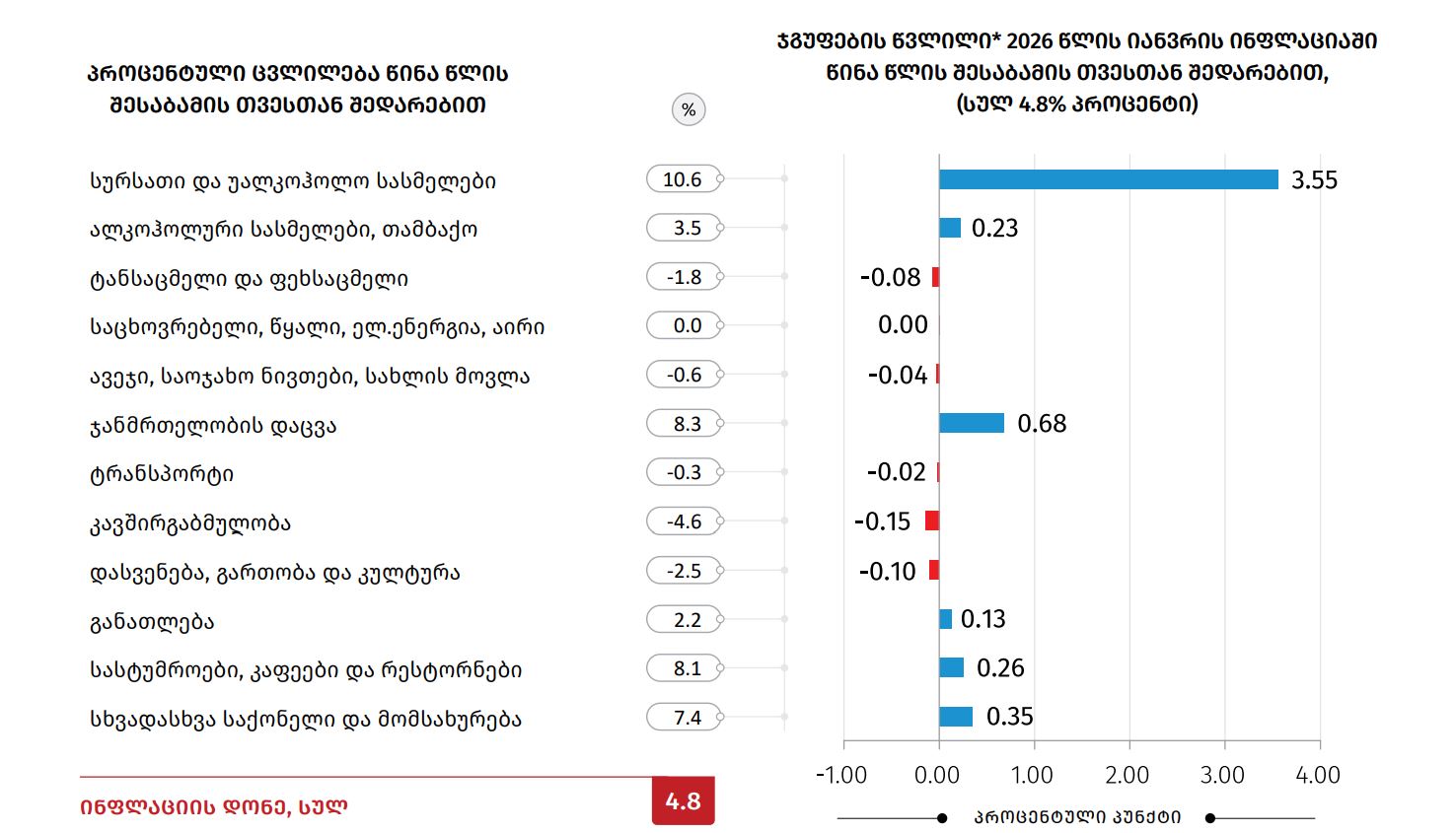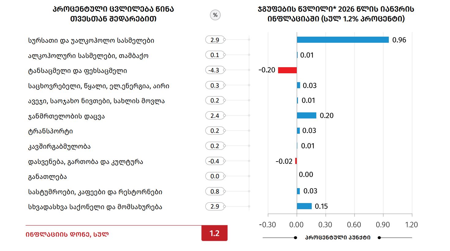 სტატისტიკის ეროვნული სამსახურის მონაცემებით, 2026 წლის იანვარში, წინა თვესთან შედარებით, საქართველოში ინფლაციის დონემ 1.2% შეადგინა, ხოლო წლიური ინფლაციის მაჩვენებელი 4.8 პროცენტით განისაზღვრა.