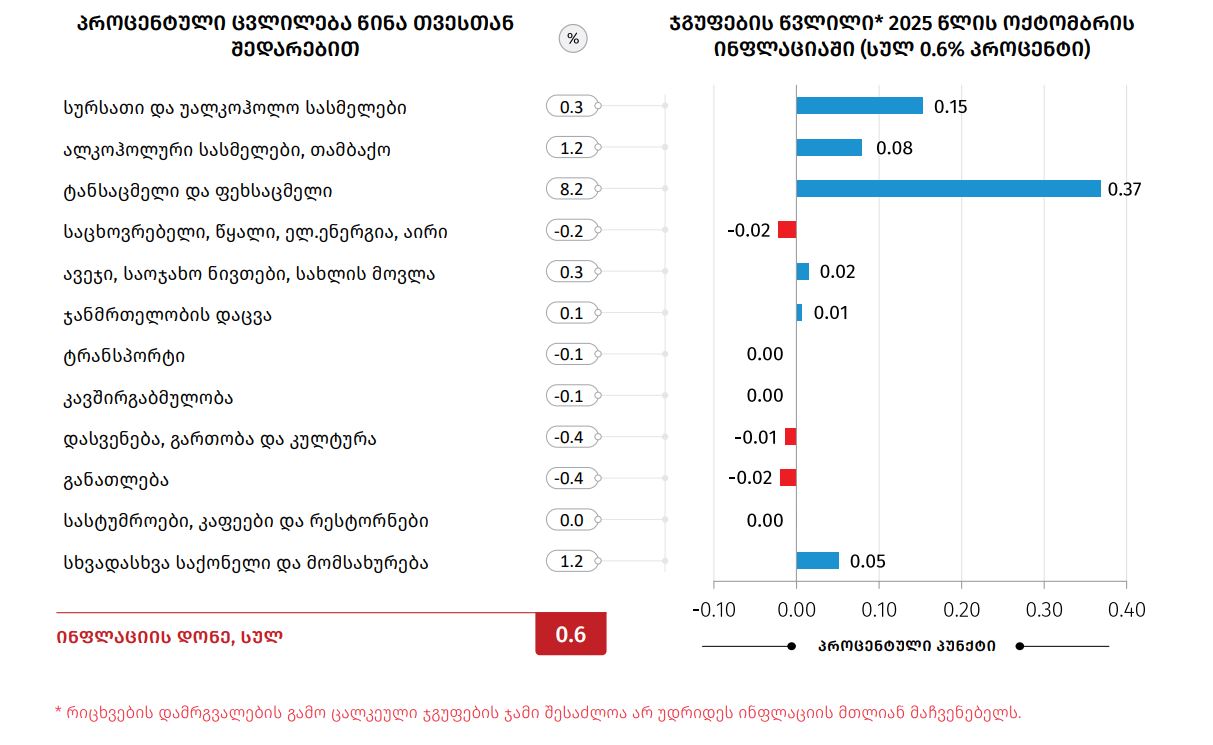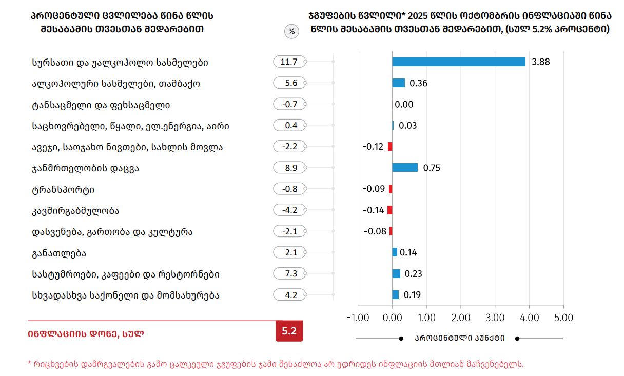 სტატისტიკის ეროვნული სამსახურის მონაცემებით, 2025 წლის ოქტომბერში წინა თვესთან შედარებით საქართველოში ინფლაციის დონემ — 0.6%, ხოლო წლიური ინფლაციის დონემ 5.2% შეადგინა.