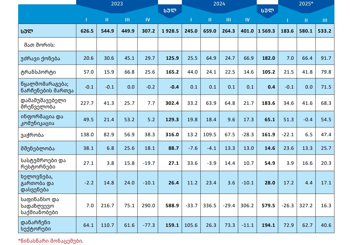 პირდაპირი უცხოური ინვესტიციები ეკონომიკის სექტორების მიხედვით 2023-2025 წლებში