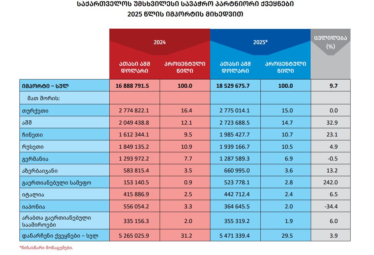 ცნობისთვის, 2025 წელს საქართველოში 1 მილიარდ აშშ დოლარზე მეტი ღირებულების საქონლის იმპორტი ხუთი ქვეყნიდან განხორციელდა, მათ შორისაა: თურქეთი, აშშ, ჩინეთი, რუსეთი და გერმანია.