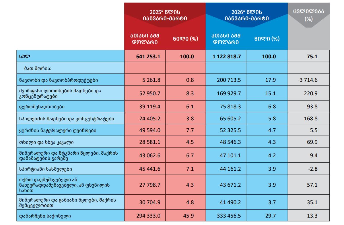 სტატისტიკის ეროვნული სამსახურის მონაცემებით, 2026 წლის იანვარ-მარტში საქართველოდან განხორციელებული საქონლის ექსპორტის მოცულობამ, არადეკლარირებული ექსპორტის გარეშე, 1.72 მილიარდ აშშ დოლარს გადააჭარბა. ეს 23.4%-ით მეტია გასული წლის შესაბამისი პერიოდის მაჩვენებელზე.