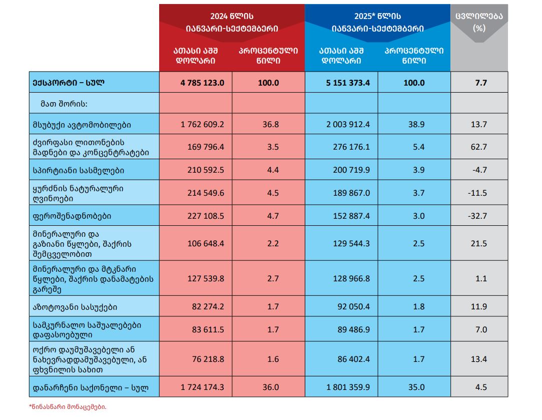 სასაქონლო ჯგუფებიდან, 2025 წლის იანვარ-სექტემბერში, საექსპორტო ათეულში პირველი ადგილი მსუბუქმა ავტომობილებმა დაიკავა 2 მილიარდ აშშ დოლარზე მეტით, რაც მთელი ექსპორტის 38.9%-ს შეადგენს. მეორე ადგილს იკავებს ძვირფასი ლითონების მადნები და კონცენტრატები 276.2 მილიონი აშშ დოლარით (მთლიანი ექსპორტის 5.4%), ხოლო სპირტიანი სასმელები მესამე ადგილზეა 200.7 მილიონი აშშ დოლარით (3.9%).