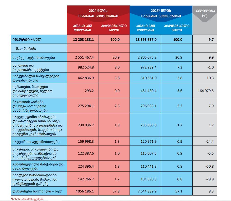 სტატისტიკის ეროვნული სამსახურის მონაცემებით, 2025 წლის იანვარ-სექტემბერში საქართველოში საქონლით საგარეო სავაჭრო ბრუნვამ, არადეკლარირებული ვაჭრობის გარეშე, 18.54 მილიარდ აშშ დოლარს გადააჭარბა, რაც წინა წლის შესაბამის პერიოდთან შედარებით 9.1%-ით მეტია. აქედან ექსპორტი 5.15 მილიარდი აშშ დოლარი იყო (გაიზარდა 7.7%-ით), ხოლო იმპორტი – 13.39 მილიარდი აშშ დოლარი (გაიზარდა 9.7%-ით).