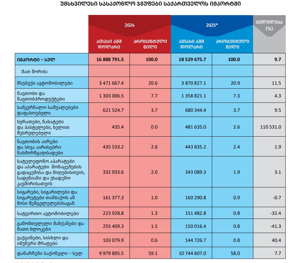 2025 წელს სასაქონლო ჯგუფებიდან საიმპორტო ათეულში, ექსპორტის მსგავსად, პირველი ადგილი მსუბუქმა ავტომობილებმა დაიკავა, რომელთა იმპორტმა ჯამში 3.87 მილიარდ აშშ დოლარს გადააჭარბა. ამ სასაქონლო ჯგუფის წილმა მთლიან იმპორტში 20.9% შეადგინა.