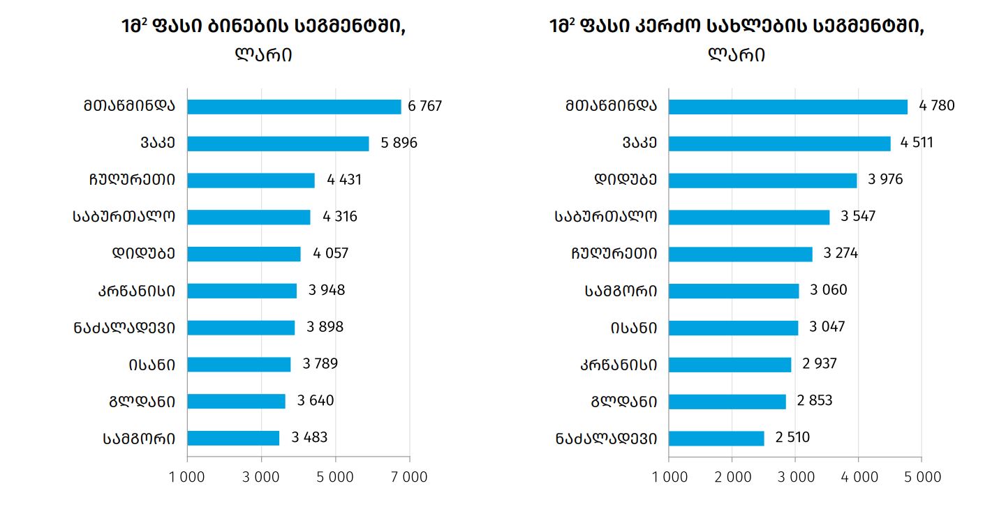 საქსტატის ცნობით, წინა კვარტალთან შედარებით საცხოვრებელი ბინების სეგმენტში ფასები 0.5%-ით გაიზარდა, კერძო სახლების სეგმენტში კი 1.2%-ით. 2024 წლის მესამე კვარტალთან შედარებით ბინების შემთხვევაში 6.9%-იანი ზრდა დაფიქსირდა, ხოლო კერძო სახლების შემთხვევაში – 7.2%-იანი.