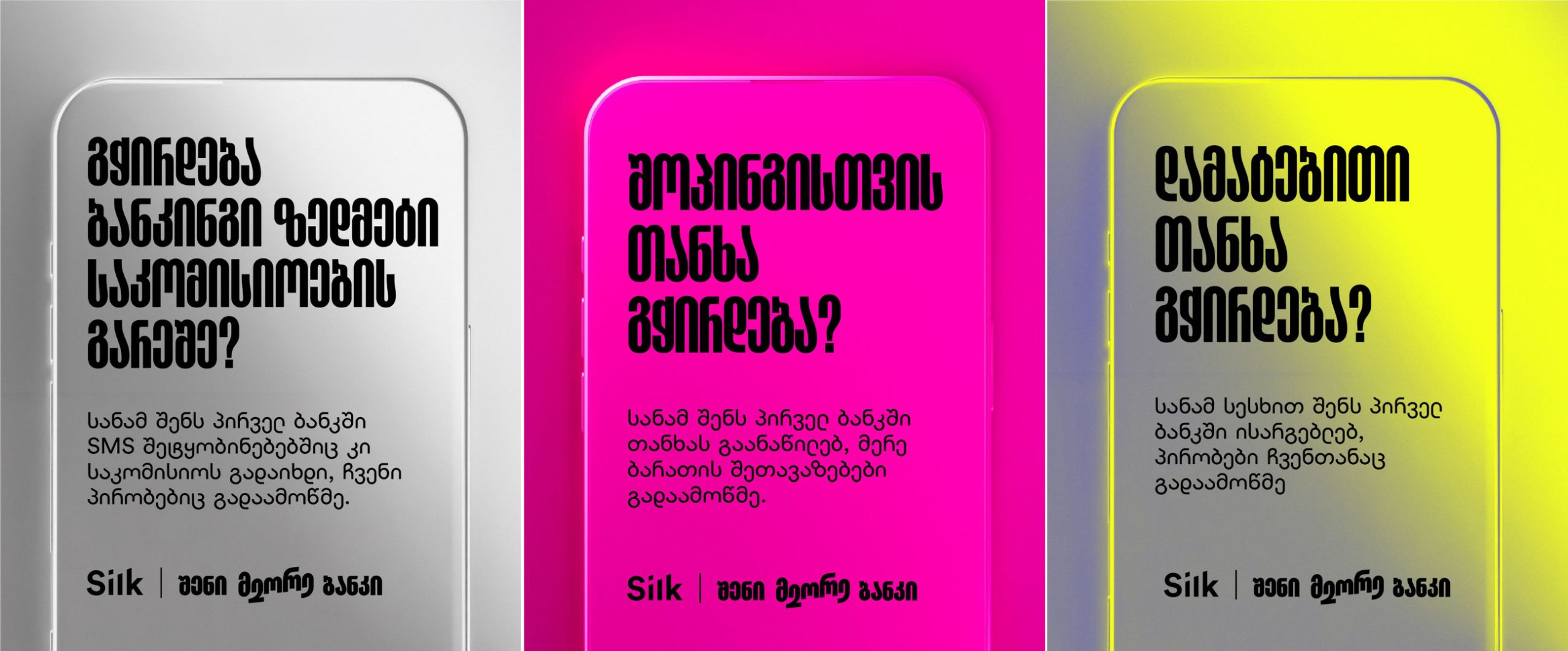 საინტერესოა, ასევე, კამპანიის პრინტსერია, რომელიც სოციალურ მედიაში და გარე ბანერებზე გაიშალა. ის კონტრასტი, რაც სილქ ბანკსა და კონკურენტებს შორისაა, ვფიქრობთ, კამპანიის დამატებით საკომუნიკაციო ელემენტებში კიდევ უფრო ნათლად გამოიხატა.