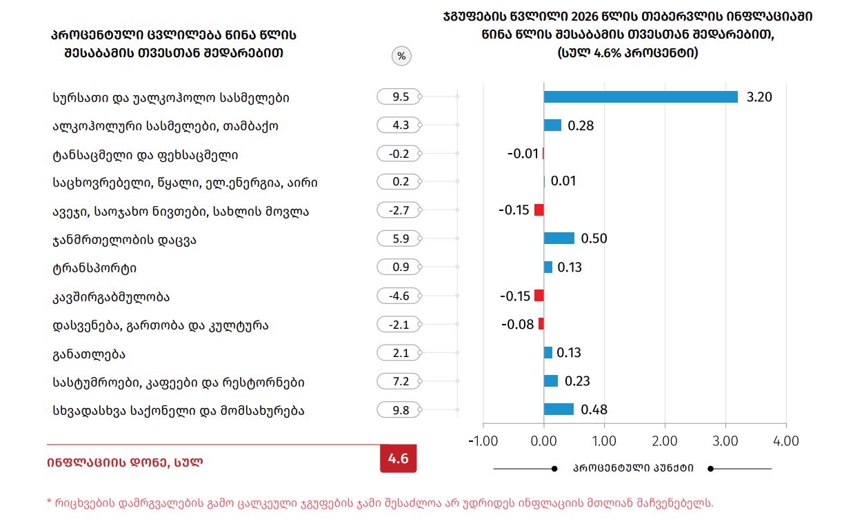 სტატისტიკის ეროვნული სამსახურის მონაცემებით, 2026 წლის თებერვალში, წინა თვესთან შედარებით, საქართველოში ინფლაციის დონემ 0.2% შეადგინა, ხოლო წლიური ინფლაციის მაჩვენებელი 4.6%-ით განისაზღვრა.