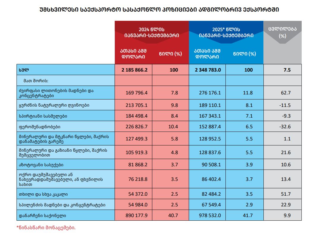 სტატისტიკის ეროვნული სამსახურის მონაცემებით, 2025 წლის იანვარ-სექტემბერში საქართველოდან განხორციელებული საქონლის ექსპორტის მოცულობამ, არადეკლარირებული ექსპორტის გარეშე, 5.15 მილიარდ აშშ დოლარს გადააჭარბა. ეს გასული წლის ამავე პერიოდთან შედარებით 7.7%-ით მეტია.